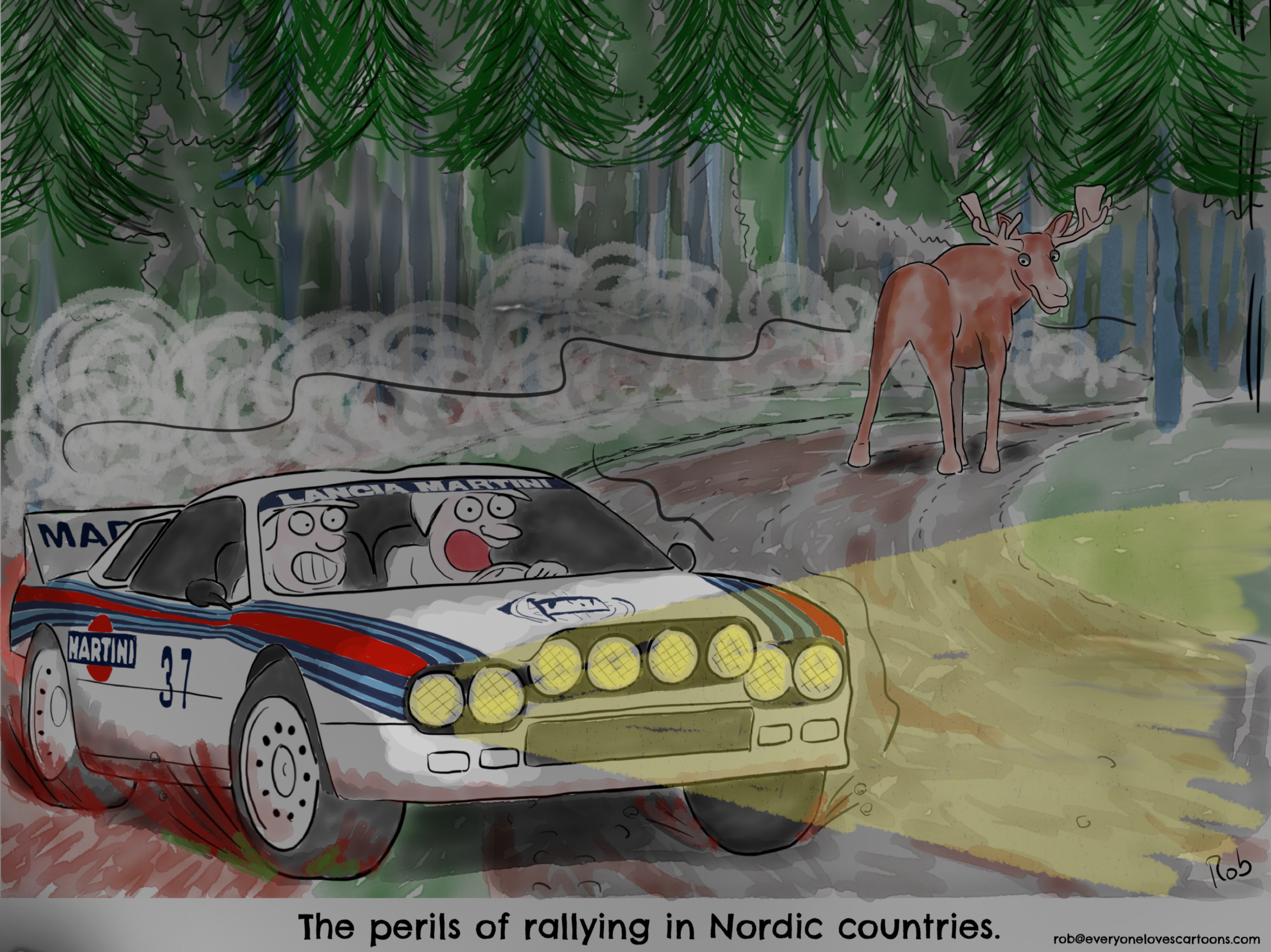 February 17, 2018 Rob Middleton Revised version - “The perils of rallying in Nordic Countries” February 17, 2018 Rob Middleton Here is a revised version of yesterday’s cartoon. Seeing is the theme is rallying, I thought I’d also try a night version. Rob Middleton