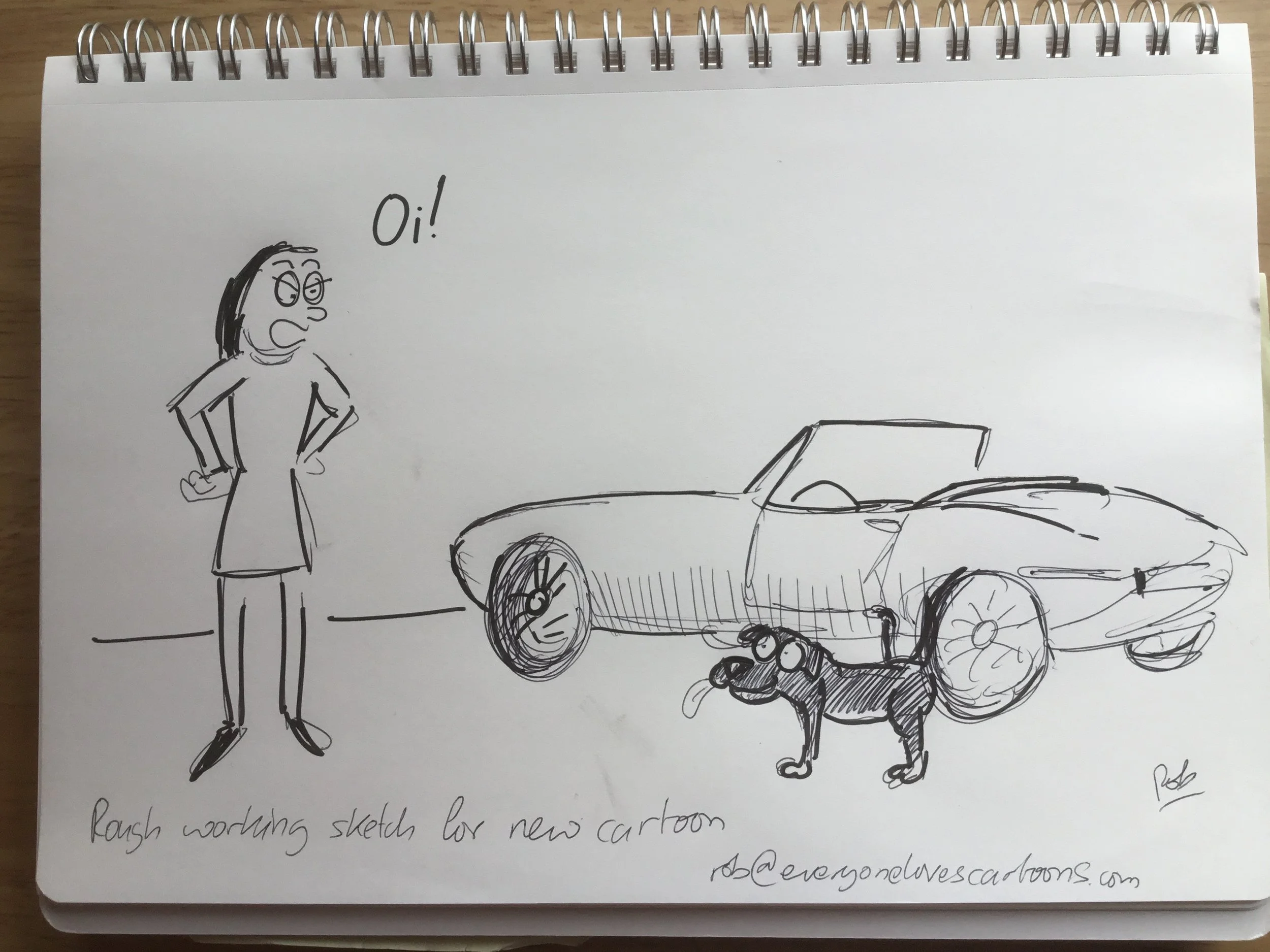 1. Here’s the initial rough sketch. As you can see, the basic idea was to have a dog doing what he had to do somewhere he shouldn’t.