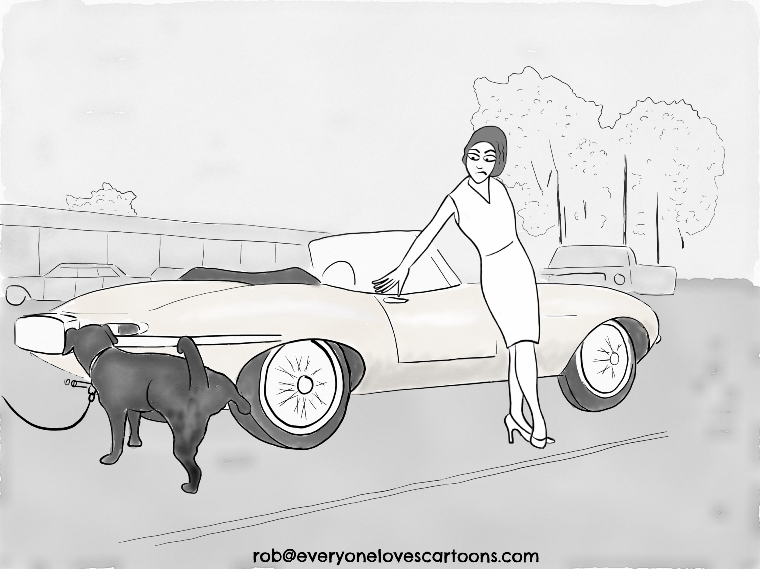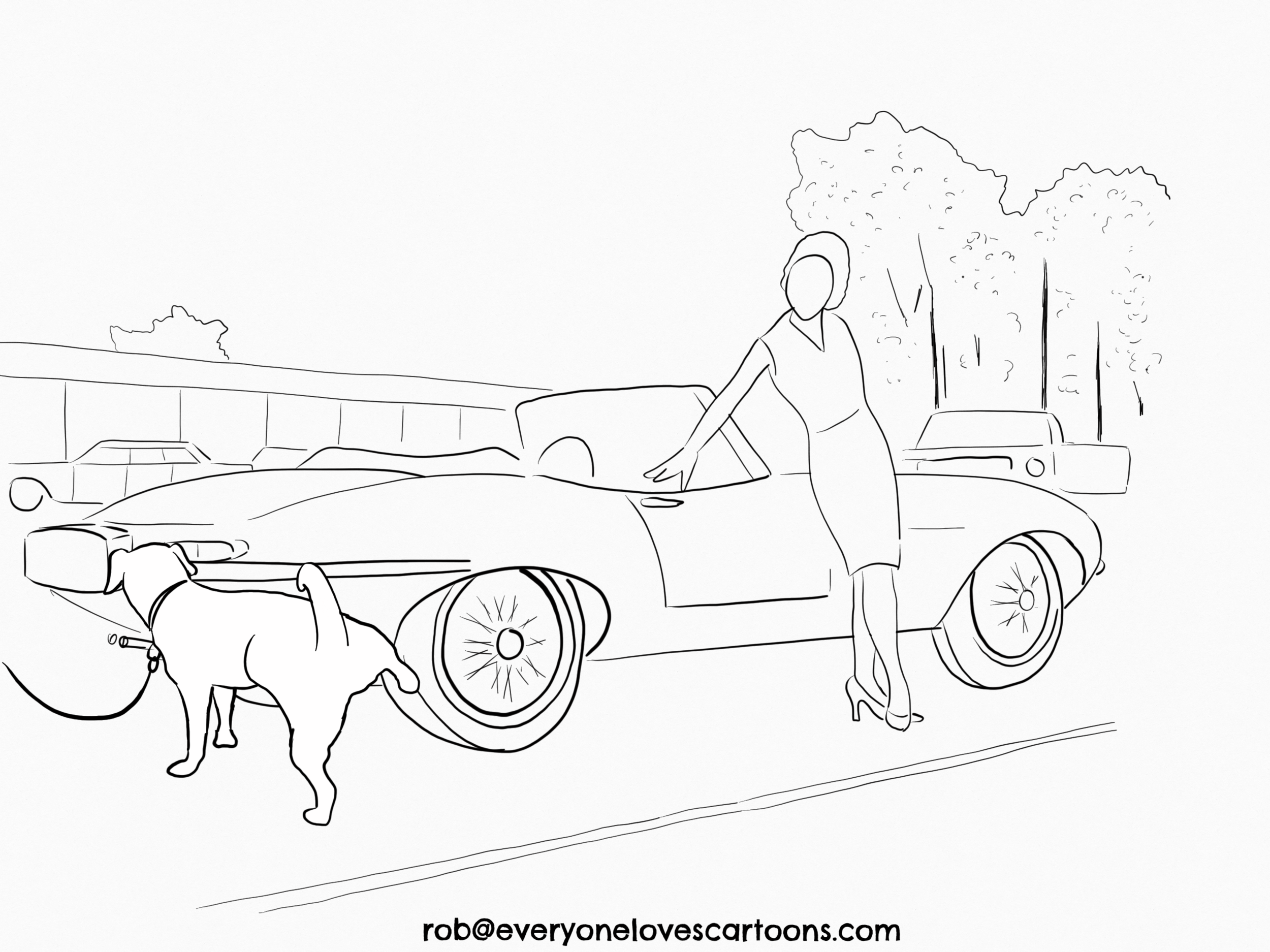 2. Outline of the characters and background. I found a photo of a woman leaning on an E-type and based the above outline on it.