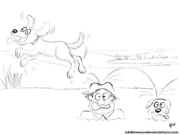 I added a bolder outline to the characters and some movement lines. I also increased the size of the Spaniel’s paws as that better fitted in with the accompanying story. I’ll post the full story soon and put a link here.